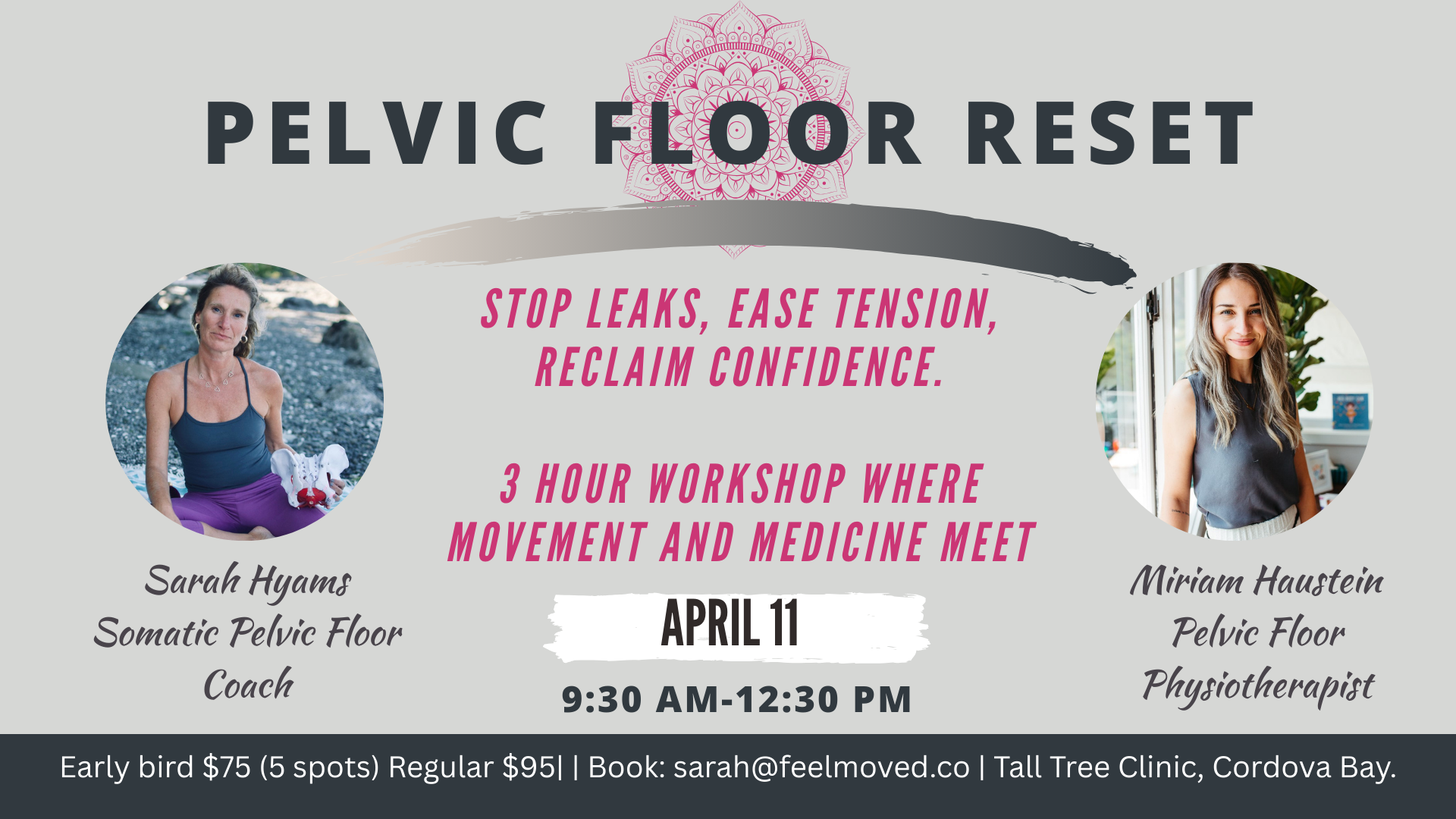 SPECIAL EVENT With Miriam Hasten- Pelvic Floor Physio and Sarah Hyams-Somatic Coach -Where Movement meets medicine. April 11 in Cordova Bay. Go here for more information.